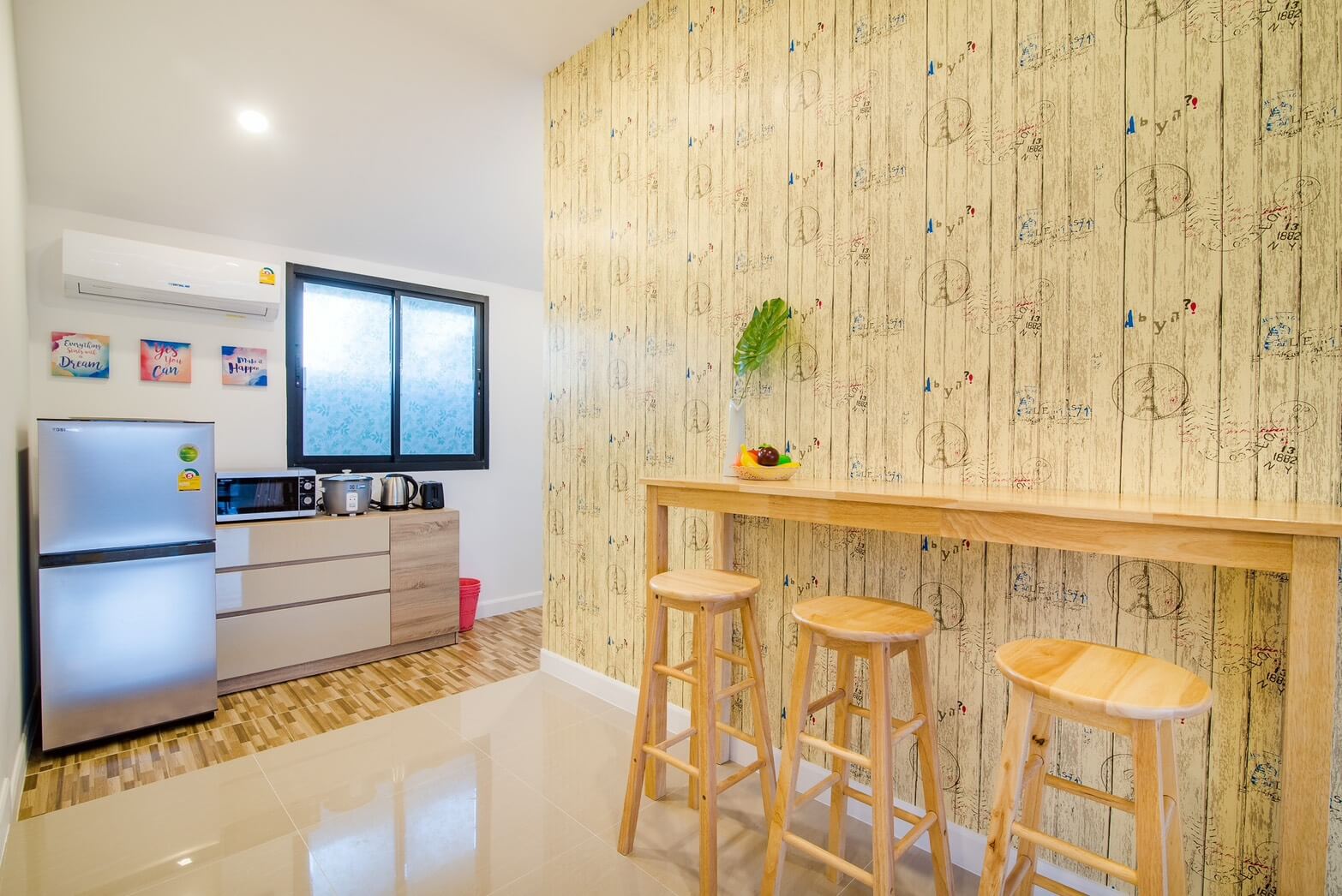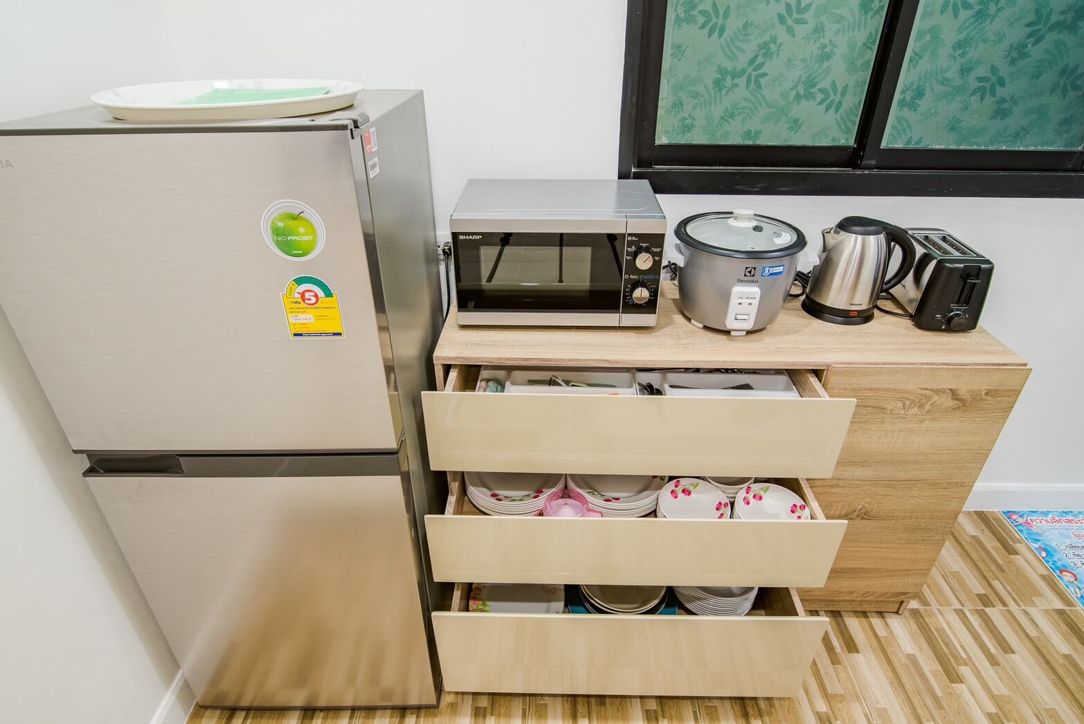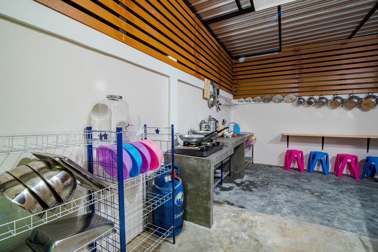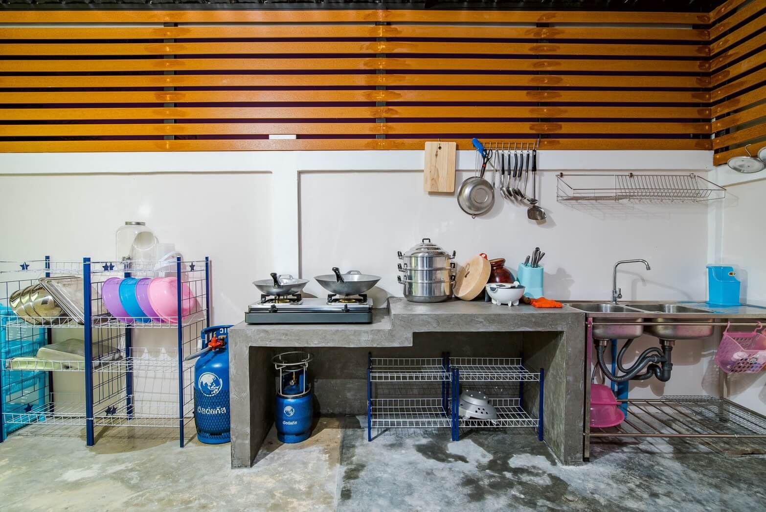 - ครัวไทย (นอก) มีพื้นที่ทำกับข้าวขนาดกว้าง อุปกรณ์ทำครัวครบ โต๊ะ เตาแก๊ส กะทะ เตาหมูกะทะ หม้อต้ม ไมโครเวฟ กาน้ำร้อน เครื่องปิ้งขนมปัง ช้อนส้อม ถ้วย ชาม จาน แก้ว ตู้เย็น,กระติกน้ำร้อน,หม้อหุงข้าว,ถังน้ำแข็ง